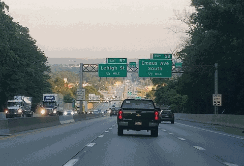 This 2017 photo shows the westbound I-78 approaching EXIT 58 (Emaus Avenue) in Allentown. This section of I-78 was originally built as the PA 309 Bypass in the late 1950s, and was widened and upgraded to Interstate standards in the 1980s. (Photo by Steve Anderson.)