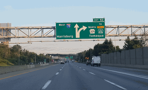 This 2017 photo shows the westbound I-78 at EXIT 53 (PA 309 Bypass) in Allentown. Northbound PA 309 departs from I-78 at this exit, and continues north towards Hazleton and Wilkes-Barre. Note the erroneous PA 476 shield where an I-476 shield should be used instead to direct motorists to the Pennsylvania Turnpike-Northeast Extension. (Photo by Steve Anderson.)